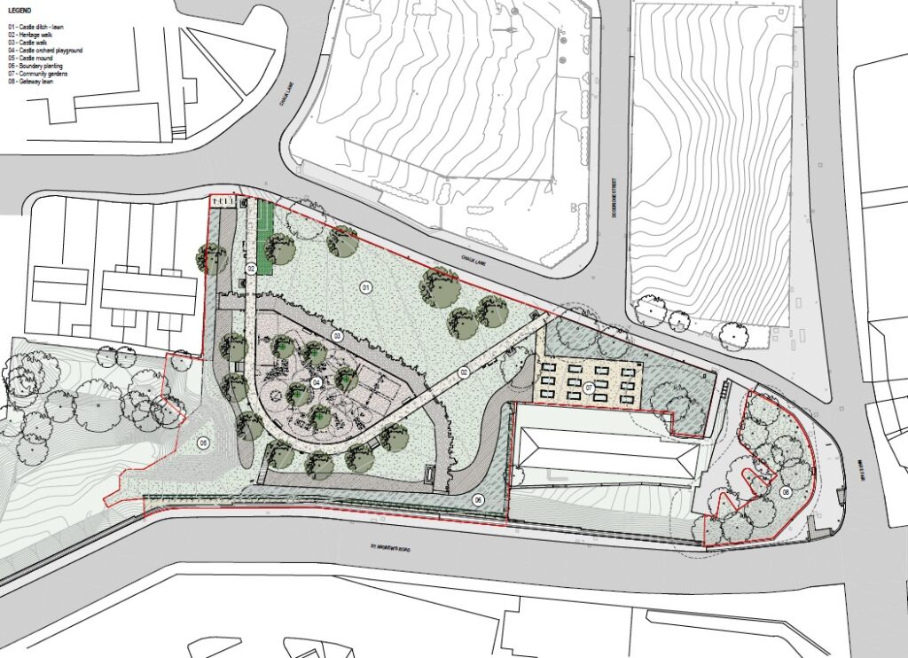 Proposals for the site include adjustments to the castle mound, hard & soft landscape works, provision of new playground area, community gardens, lighting, fencing heritage features and story boards.