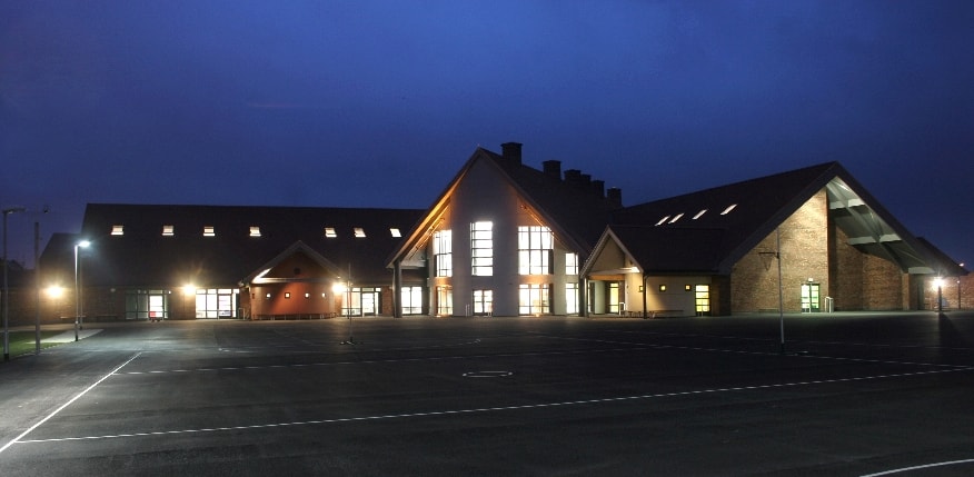The single storey building, ‘V’ shaped in plan, had steeply pitched roofs with an internal open ceiling arrangement and clear internal spans. Classrooms and teaching spaces were provided in the two wings, while the central hub housed the main Hall, Library and administration offices. A steel portal framed structure was developed and the roof surfaces were clad in timber and tiling, while the walls were formed from masonry and Trespa clad timber panels. Permeable paving was provided to external surfacing which allowed storm water to be discharged via soakaways while main infrastructure was drained by swales in accordance with the principles of SUDs.